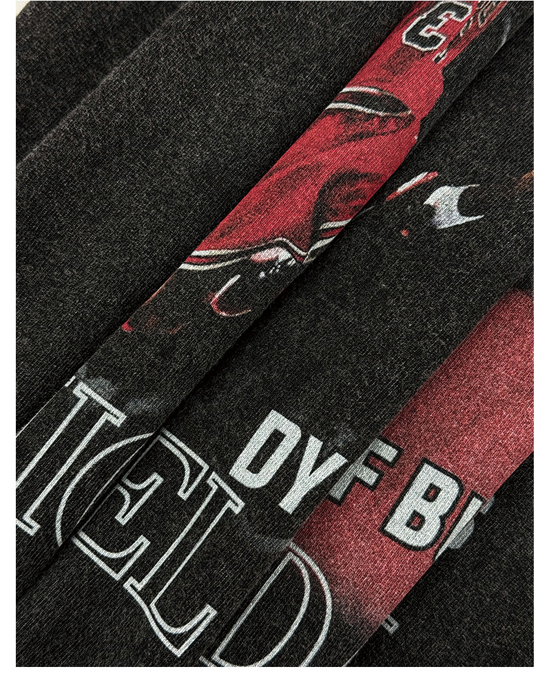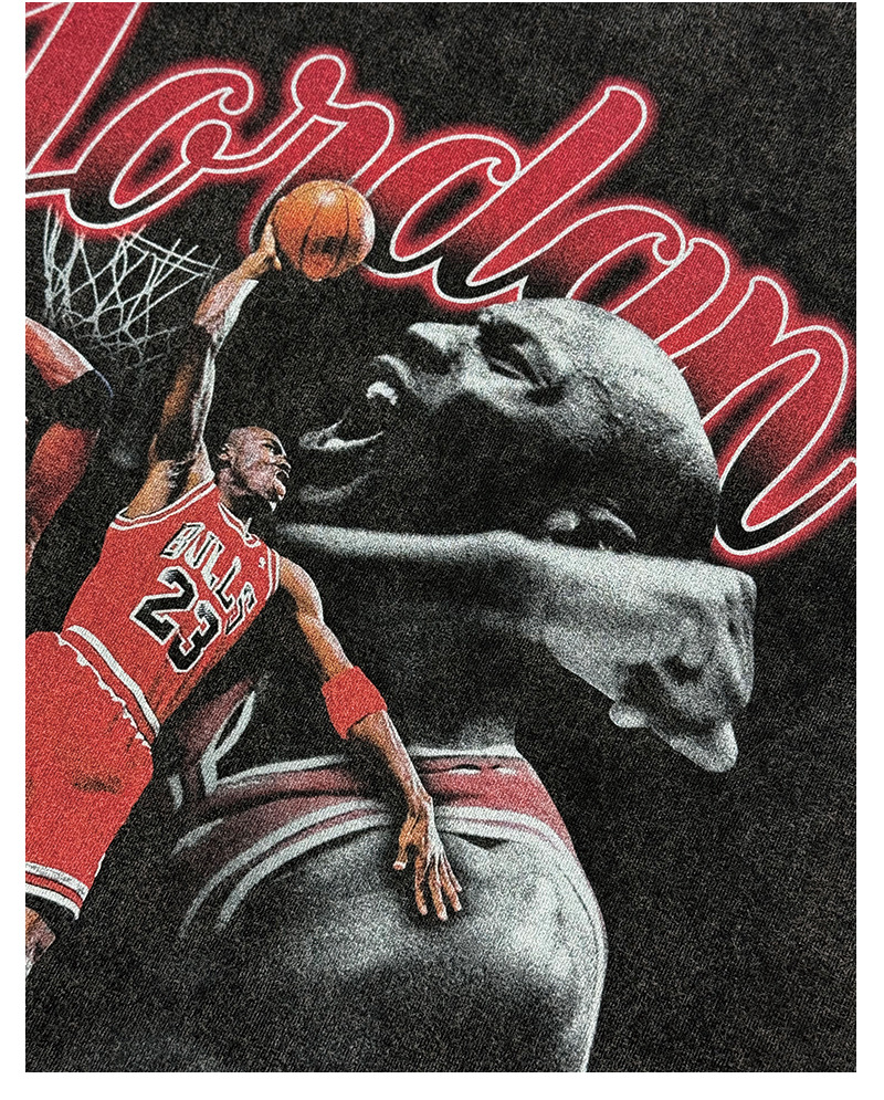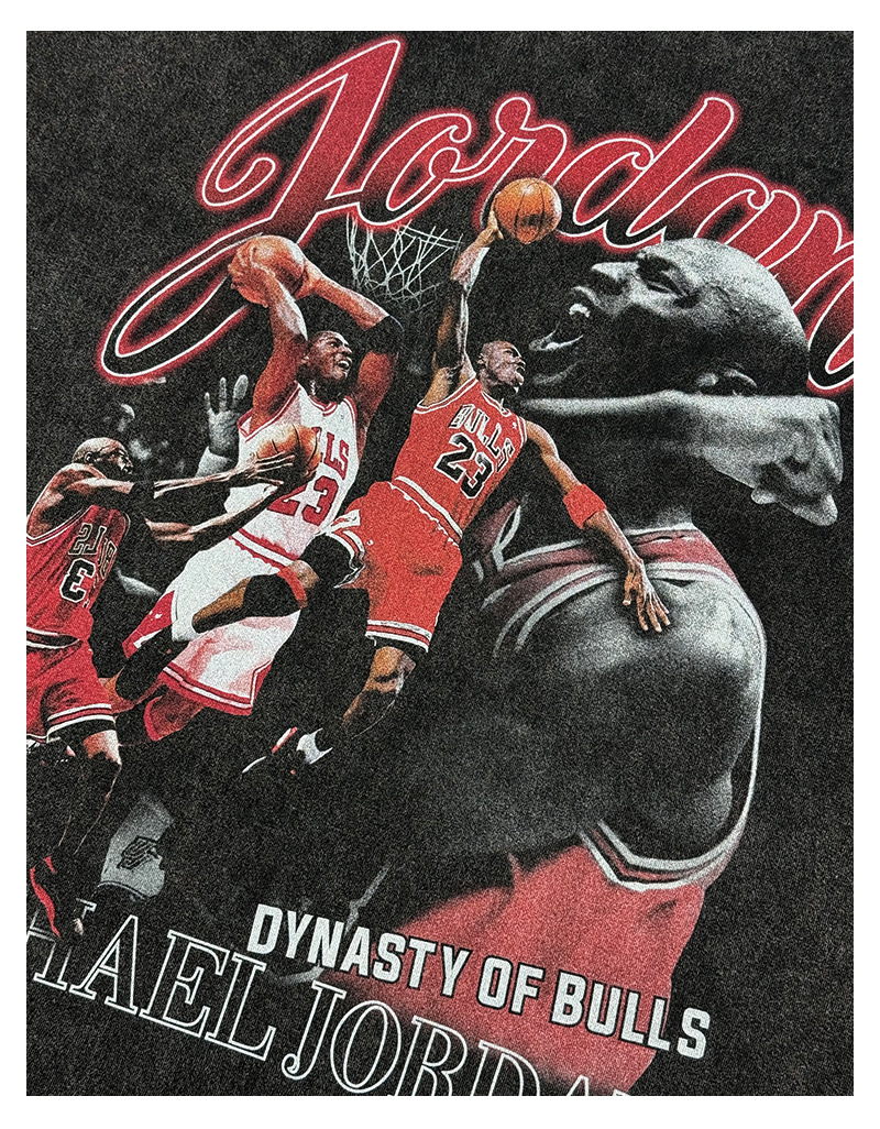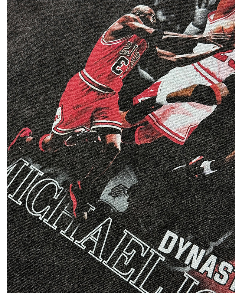 A statement piece for true basketball heads. This washed black tee features a bold, vintage-style graphic celebrating the legacy of Michael Jordan, from soaring dunks to championship moments. The collage design pops with rich reds against a faded black base, giving it that worn-in, streetwear edge straight out of the ’90s.